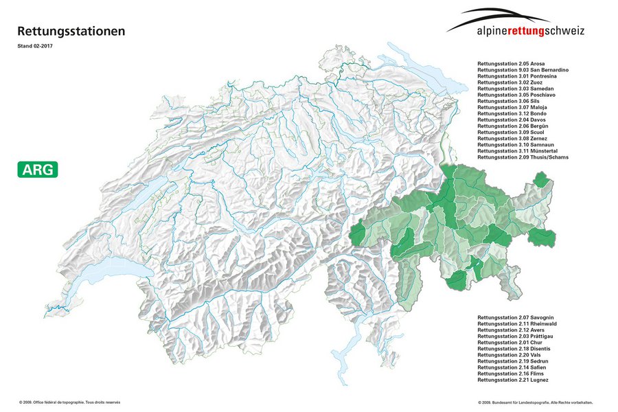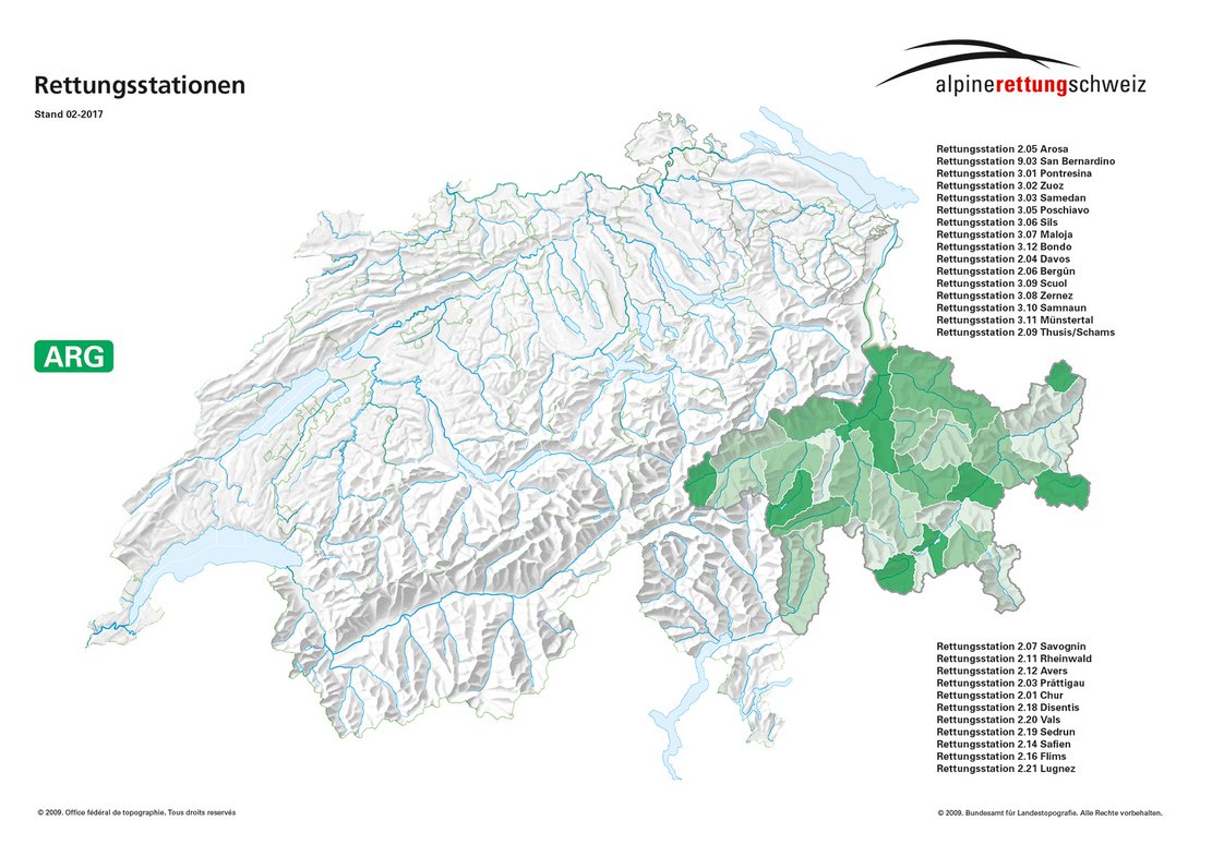 L’association du Secours Alpin des Grisons représente tout le canton et a pour membres les sections CAS ci-après: CAS-Arosa, CAS Bellinzona, CAS-Bernina, CAS Bregaglia, CAS-Davos, CAS-Engiadina Bassa, CAS-Piz Platta, CAS-Prättigau, CAS-Rätia et CAS-Terri. L’ARG compte 27 stations de secours.